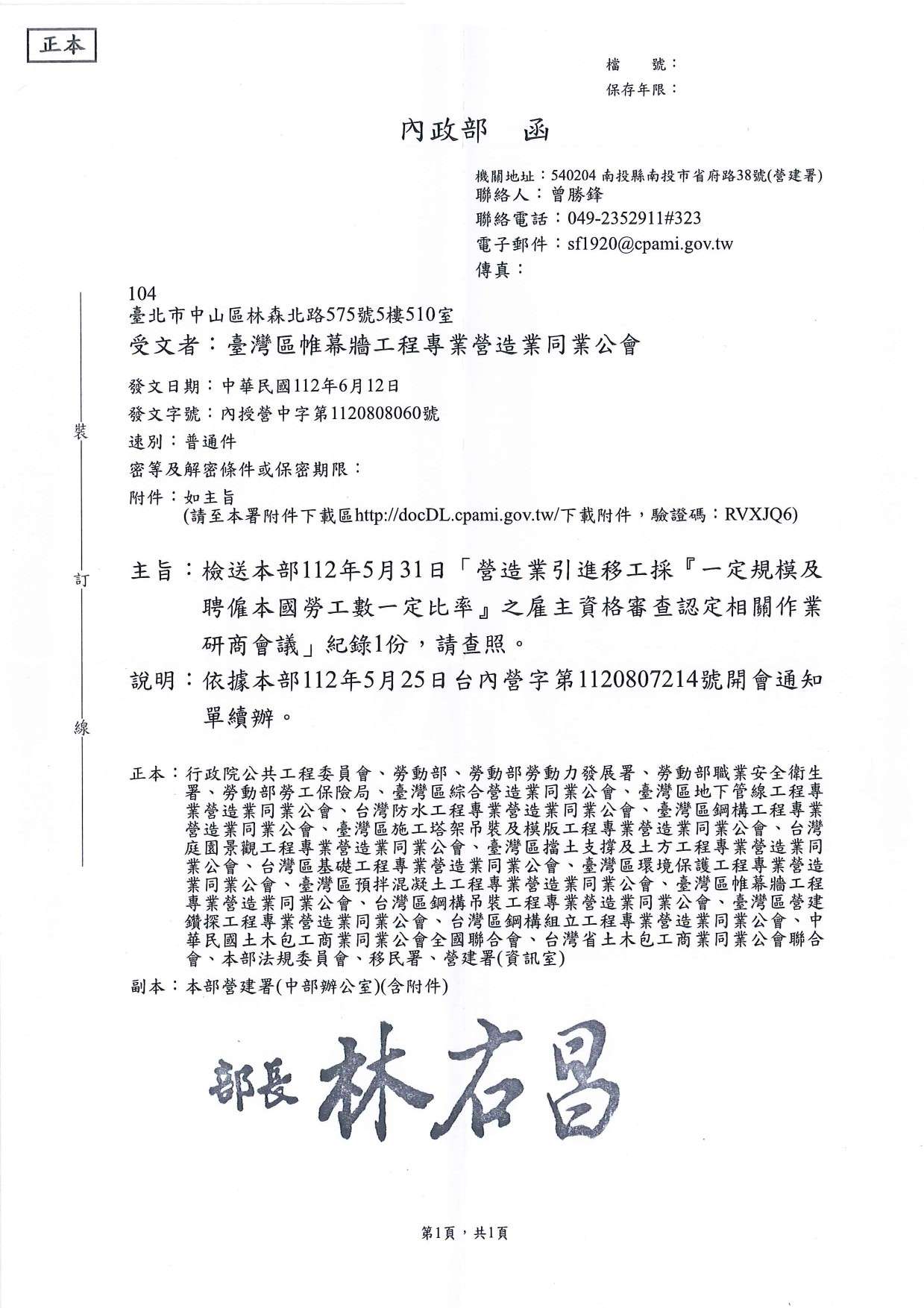 政府函文 政府函文 營造業引進移工及聘僱本國勞工之雇主資格審查研商會議記錄- 內政部 twnwall twnwall 2023-06-13 551 內政部112年5月31日,召開"營造業引進移工採(一定規模及聘僱本國勞工數一定比率)之雇主資格審查認定相關作業研商會議"會議記錄。 附件:會議記錄 上一篇 下一篇