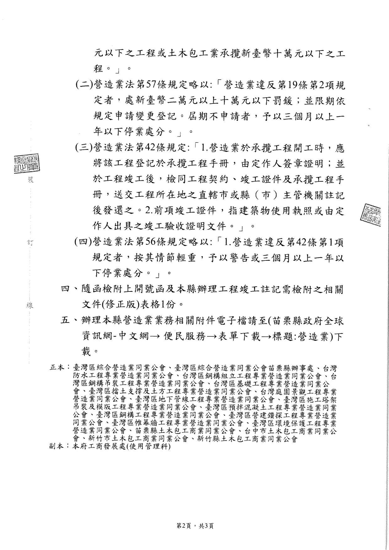 政府函文 政府函文 營造業辦理工程竣工註記之辦理時效- 苗栗縣政府 twnwall twnwall 2023-08-05 799 主旨:有關營造業辦理工程竣工註記之辦理時效,依據內政部營建署112年7月4日 營署中建字第1120041372號函辦理,詳閱函文及附件。 附件:附件 上一篇 下一篇